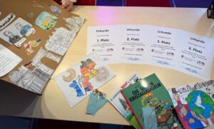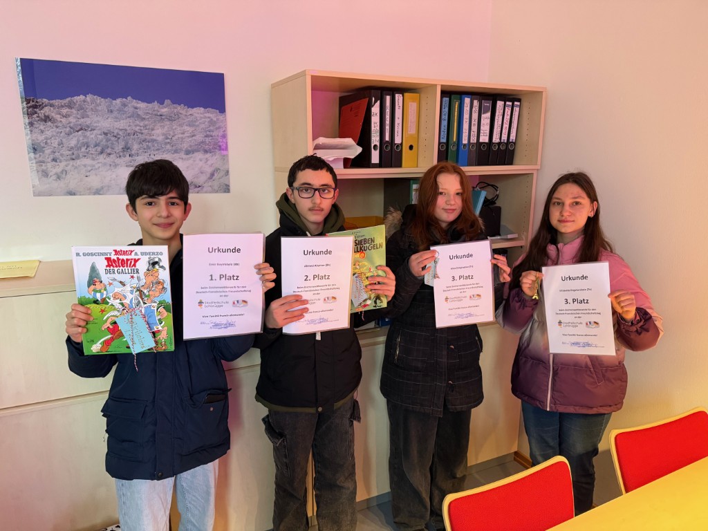 Gewonnen haben auf dem ersten Platz, Emir (8B), Ahmed (8B) und Eliza und Alisa (7E und 7C). Alle vier wurden von unserer Abteilungsleitung Frau Fittkau beglückwünscht und Urkunden und ein Preisgeschenk überreicht.